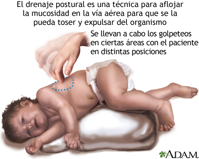 • Evacuar o sacar el moco o las secreciones de las vías respiratorias. Esto debe hacerse de 1 a 4 veces todos los días. Los pacientes, las familias y los cuidadores deben aprender a realizar la percusión torácica y el drenaje postural para ayudar a mantener las vías respiratorias despejadas.