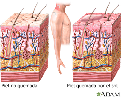 La quemadura solar se presenta cuando el grado de exposición al sol o a las fuentes de luz ultravioleta exceden la capacidad de la melanina para proteger la piel. La Melanina es la coloración (pigmento) que protege la piel. Una quemadura solar en una persona con piel muy clara puede ocurrir en menos de 15 minutos de exposición al sol del mediodía, mientras que una persona con piel oscura puede tolerar la misma exposición por horas.